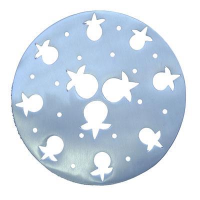 The trivet is a circle of silver aluminum with an outline of more than a dozen pomegranates, branches, and leaves. The design is modern and sleek, made from an aluminum cast.