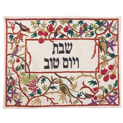 The challa cover is decorated with a forest of birds on fully bloomed trees with the embroidered words "Shabbat Ve Yom Tov" (Shabbat and Holiday) in Hebrew.