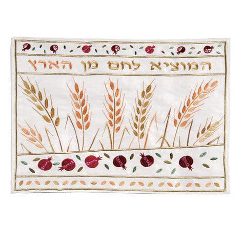 This Challa cover is beautifully designed with bright olive and golden sheaves of wheat and lushes red pomegranates, with the words "HaMotzi Lechem Min Ha-Aretz" (He who brings forth bread from the land) in Hebrew on a white background.