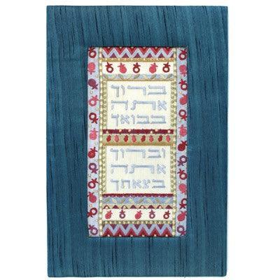 The frame is turquoise raw silk and the picture is embroidered on raw silk in blue, green, pink, and red with pomegranates and zigzags lining around the greeting," Baruch ata bevoecha ubaruch ata bezetecha" ( Blessed are you in your coming and your going) in Hebrew.