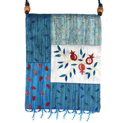 The bag is made of colorful raw silk patches. The embroidery features a beautiful design of pomegranates and leaves over raw silk fabrics in striking shades of blue. Attractive glass beads line the bottom of the bag and the strap is accented with wooden beads.