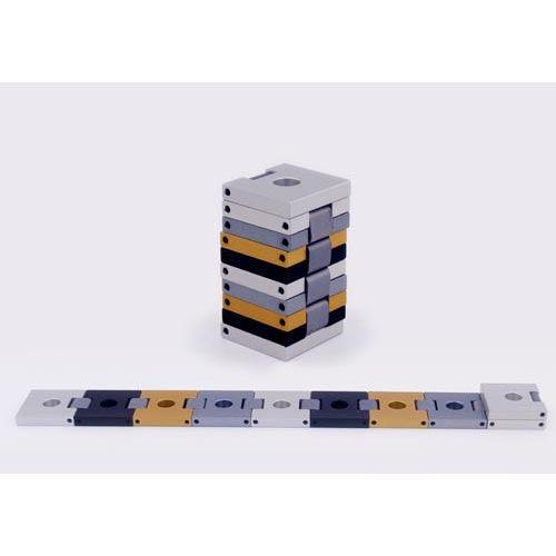 THE BELT TRAVELING MENORAH. This chain of connected square candleholders is fabricated in lightweight anodized aluminum. The pieces fold up into a smooth column that is easily packed for travel. And the connected links of the belt unfold into a streamlined, handsome Hanukah Menorah. A great gift idea for the professional man or woman who has everything. Comes in a small box.