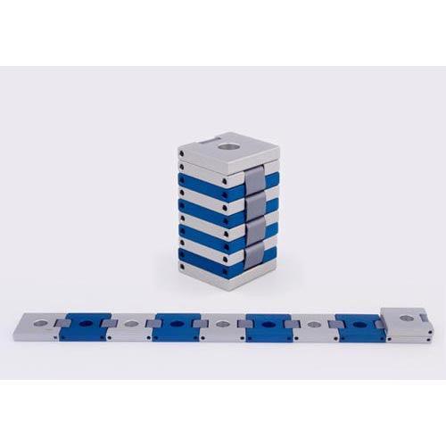 THE BELT TRAVELING MENORAH. This chain of connected square candleholders is fabricated in lightweight anodized aluminum. The pieces fold up into a smooth column that is easily packed for travel. And the connected links of the belt unfold into a streamlined, handsome Hanukah Menorah. A great gift idea for the professional man or woman who has everything. Comes in a small box.