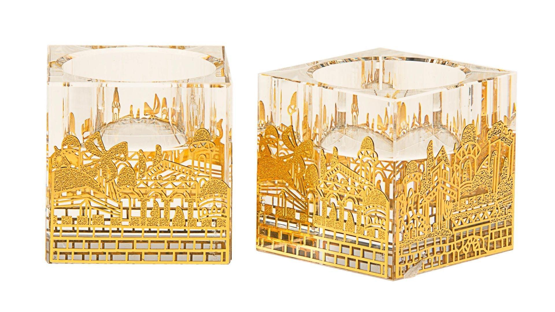 1 set of 2 candle sticks in crystal with the scene of Jerusalem in Gold Dimensions 1.75x1.75