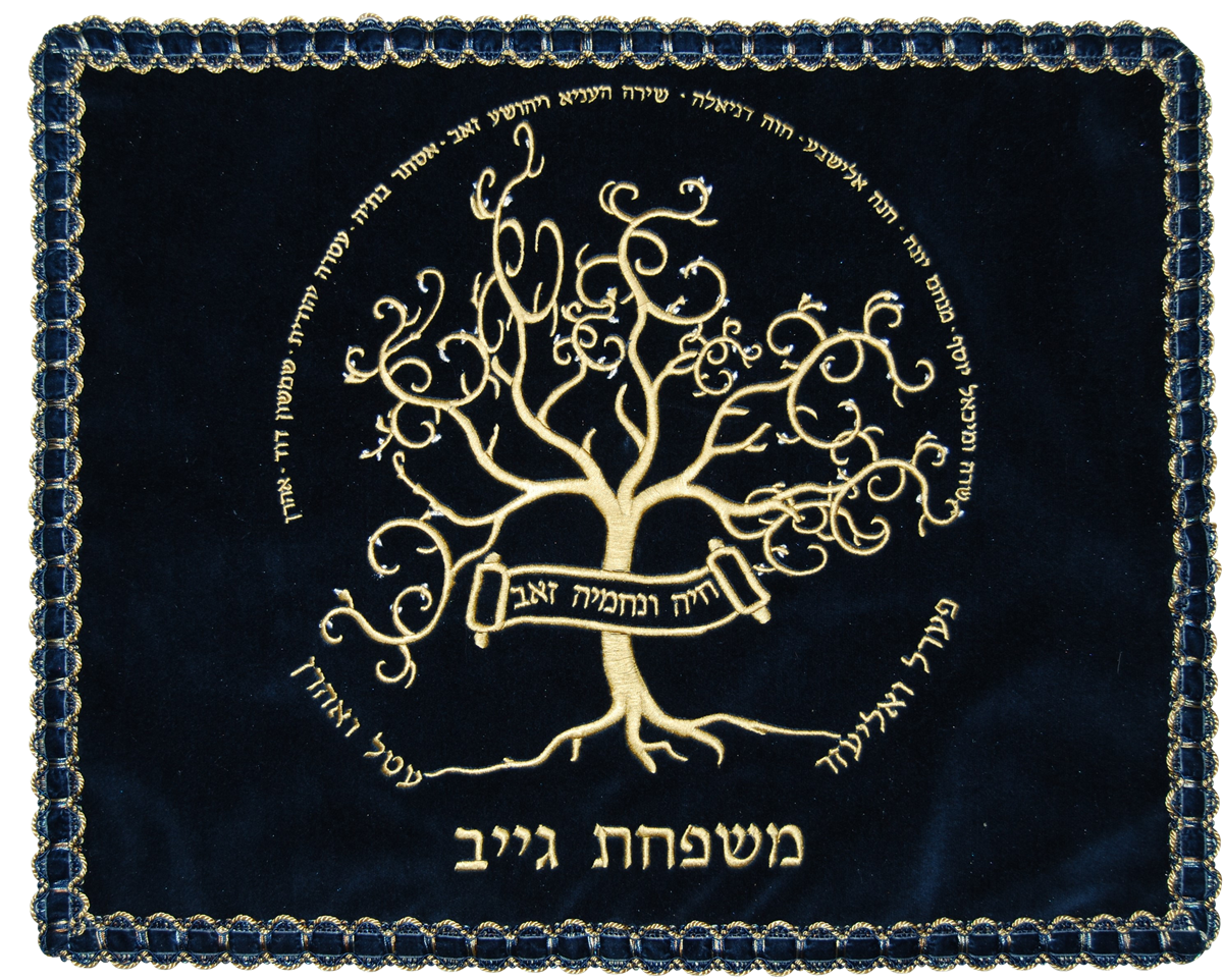 Velvet Challah cover with artistic tree embroidery design and family names listed