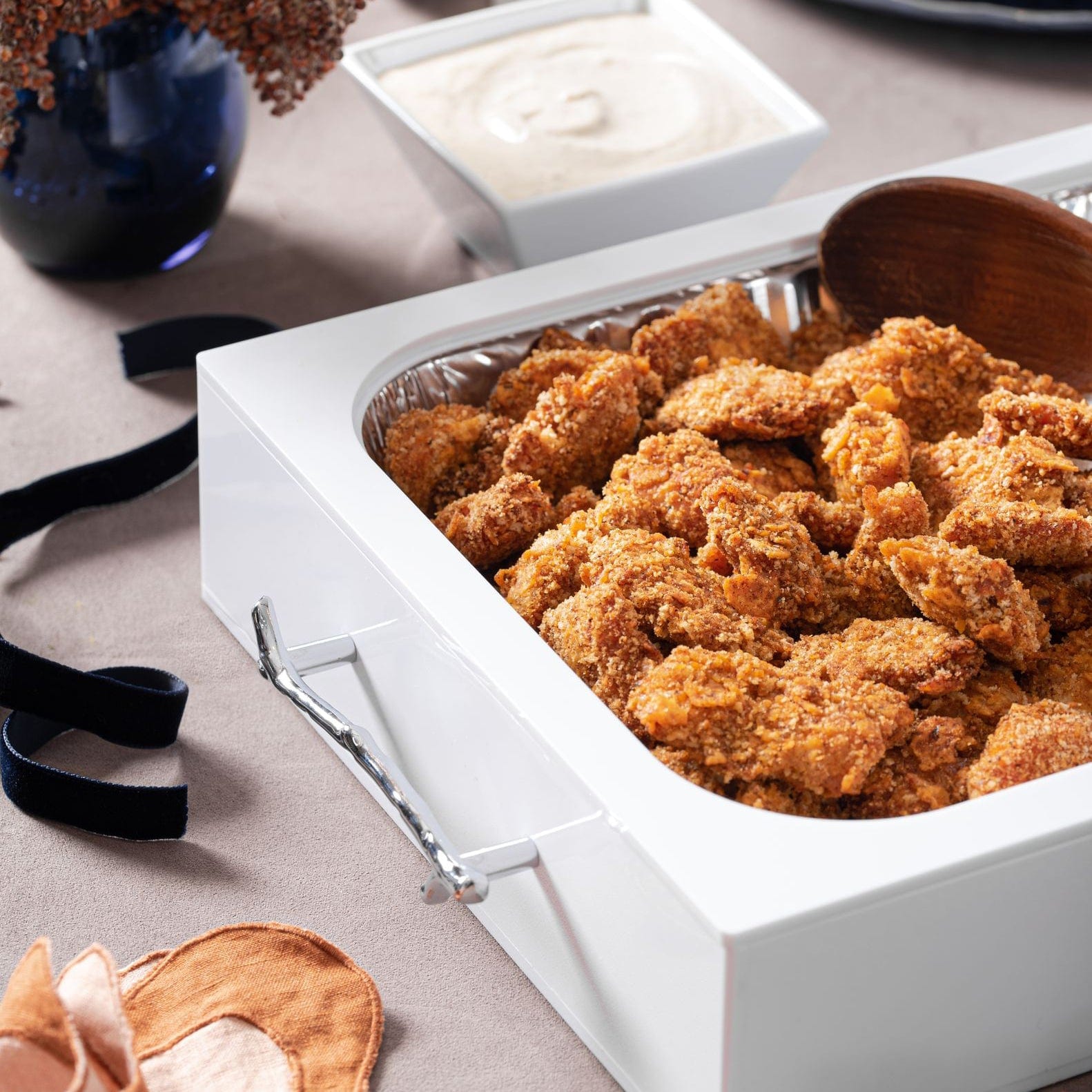 Place your filled 9x13 disposable pan directly into the dish. Then hide the rim with the second lucite layer, keeping your disposable pan totally out of site. Use the clear lucite lid to cover your dish and keep your food warm.