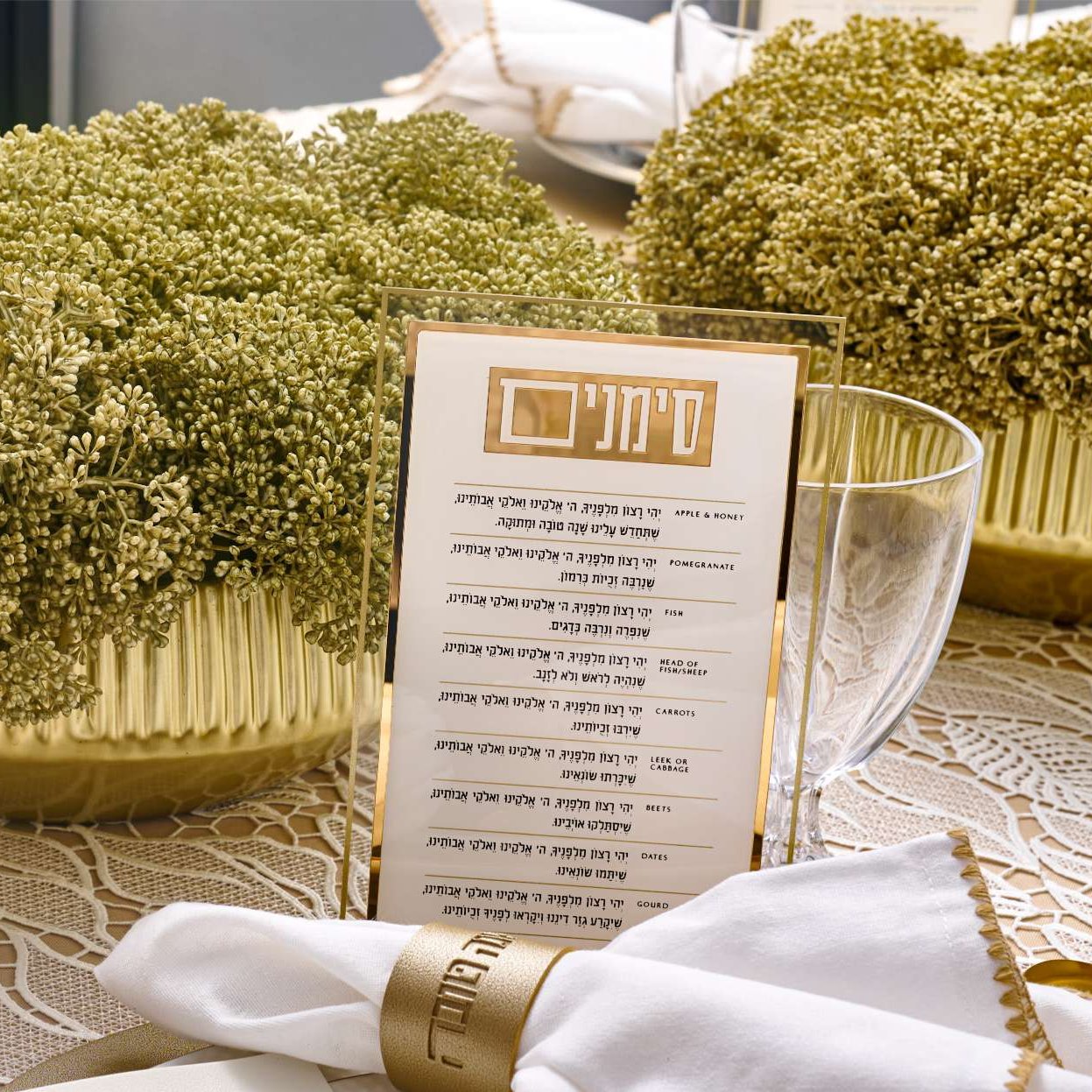 This stunning Classic 2.0 Simanim Card is the perfect and practical addition to your Rosh Hashanah table! Set by each seat or use as a gorgeous centerpiece. Wipe down, honey proof, and water proof.