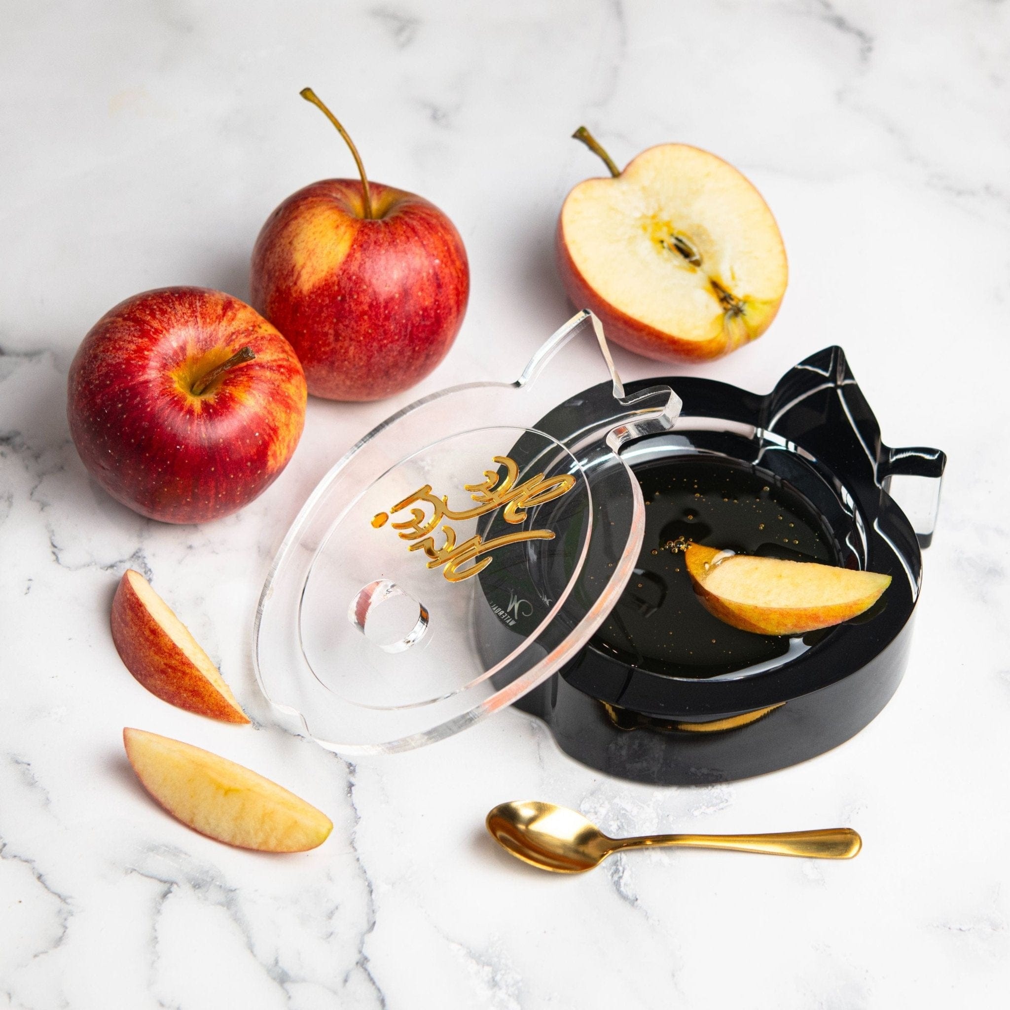 This beautiful Die-Cut Apple Honey Dish will sweeten up your Rosh Hashanah. This luxury honey dish features thick clear lucite in a die-cut apple shape, and a click in cover with a hole to fit the spoon. Bring on the apple with an elegant twist! Super easy to clean. The perfect way to display your honey!