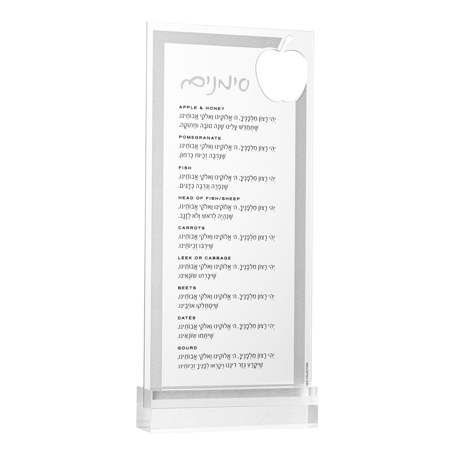 This stunning Die-Cut Apple Simanim Card is the perfect and practical addition to your Rosh Hashanah table! Set by each seat or use as a gorgeous centerpiece. A gorgeous die cut apple on the top finishes off this gorgeous look. Bring on the apple with an elegant twist. Wipe down, honey proof, and water proof.