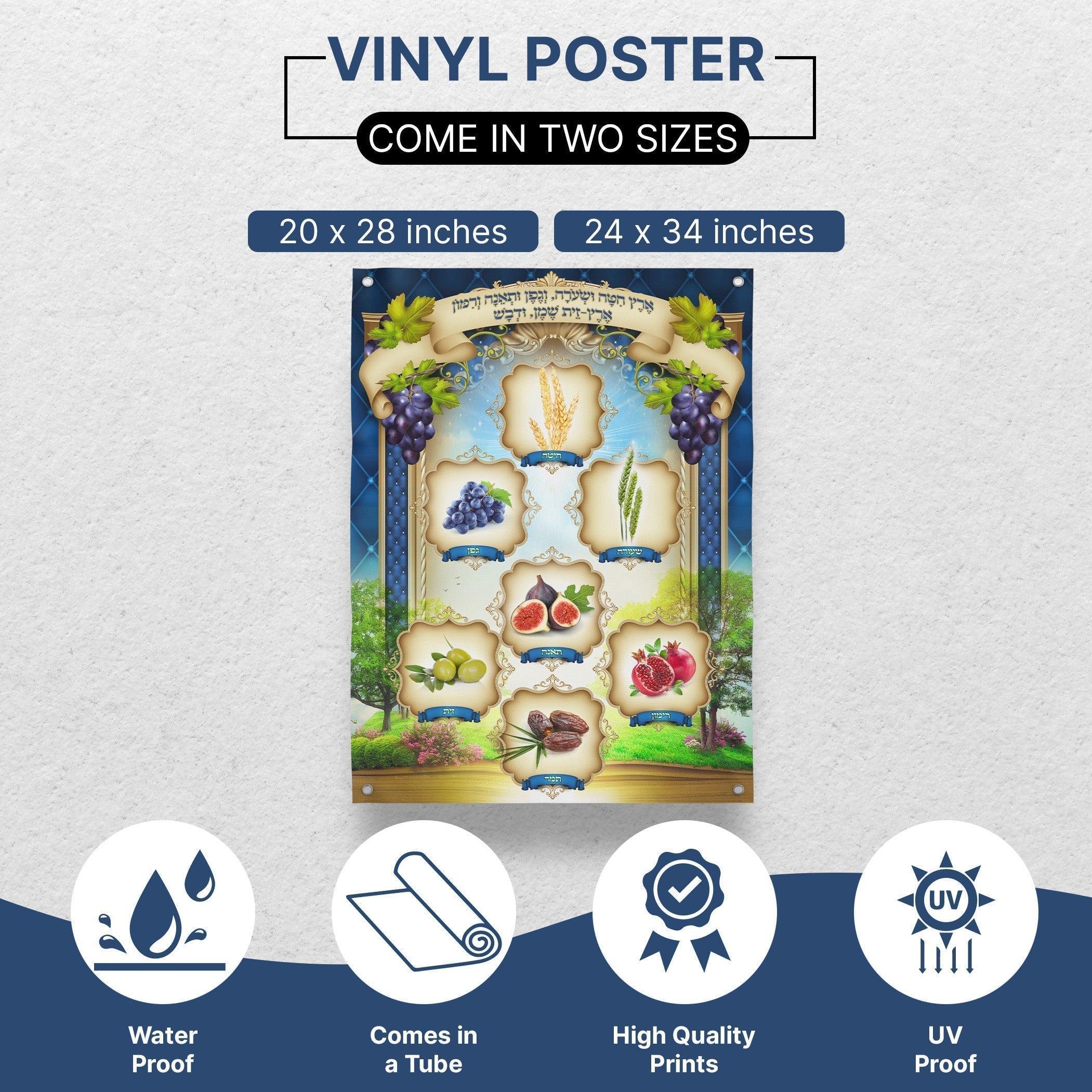 Introducing our Elegant Seven Species Sukkah Poster, a vibrant tribute to the Sukkot festival. This poster beautifully showcases the Seven Species, symbolizing prosperity and blessings, and is designed to add an air of elegance and tradition to your Sukkah.